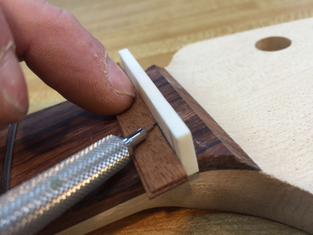 Below: The veneer strips (which stack about .050″ tall) are used to draw a line across the blank which closely matches what the fingerboard radius will be.