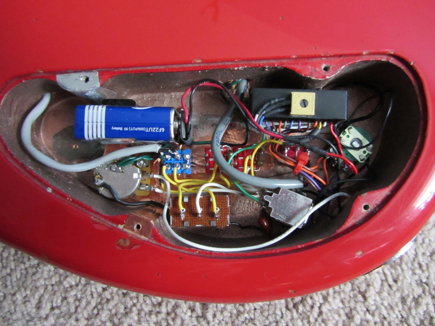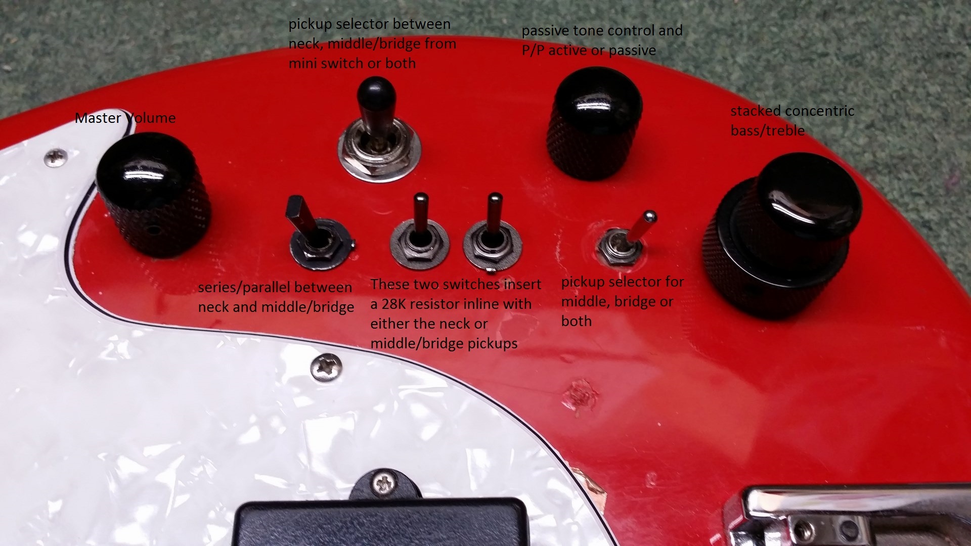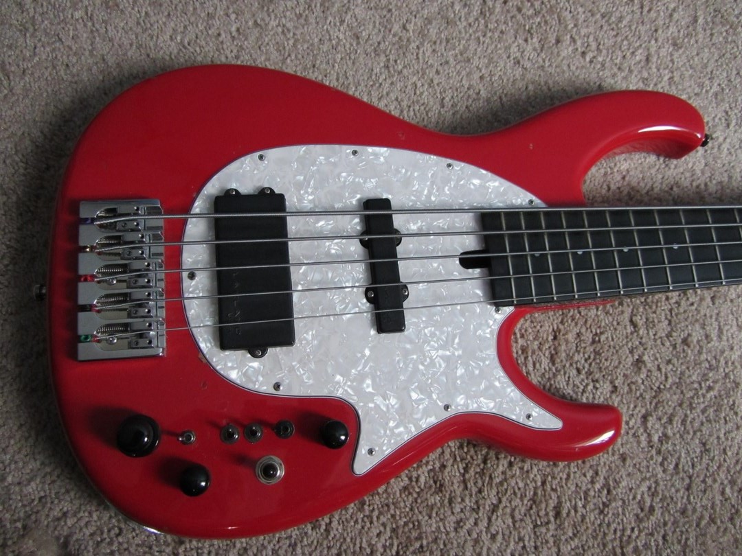 The bass started as a stock but damaged Flea 5. I repaired a lot of damage to the finish on the back of the neck, and then decided that although the bass sounded pretty good, with the great tone and stability of the neck I wanted a more versatile instrument. I purchased a pair of used Lakland pickups from a 55-94 and routed for/installed them along with the three position mini on-on-on switch for the bridge pickup coil selector and kept the original Bartolini 2 band active bass/treble controls, then designed and fabricated a new pick guard based around a combination of the original Flea pick guard and a MusicMan Stingray 4-style guard. I installed the bridge pickup so that the rear coils would be in 70’s Jazz location, with the neck pickup in standard Jazz neck pickup location. This compromises the StingRay tone some but more than makes up for it with the Jazz sounds (if you’re familiar with the Lakland 5502/5594 series basses). Still desiring more variety, I decided to replace the pickup pan control with a three way pickup selector, ala a Les Paul. But in order to still be able to slightly favour the timbre of either pickup, I adopted the idea used in the Fender Roscoe Beck Jazz bass, where a mini switch is set up with a 28k resistor- one setting on the switch bypasses the resistor, the other selection runs that pickup signal through it to slightly reduce the gain, thus favouring the other pickup…I installed one per pickup. I also wired in a passive tone control placed ahead of the preamp, coupled with a push/pull active/passive switch. Lastly, I installed a mini on-on switch to enable series/parallel switching between the neck pickup and bridge pickup. Although a close friend now owns this bass, IMHO it is the most versatile and best sounding bass I have ever played as far as standard fretting goes (I now play a Dingwall Z3, which is the bomb). But the Modulus is the one of my many builds/modded basses that I am proudest of.