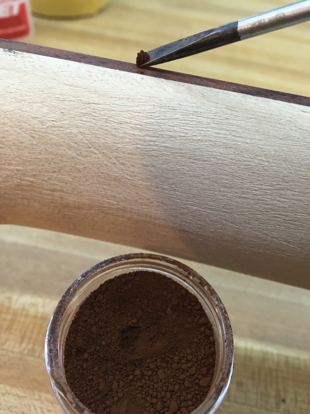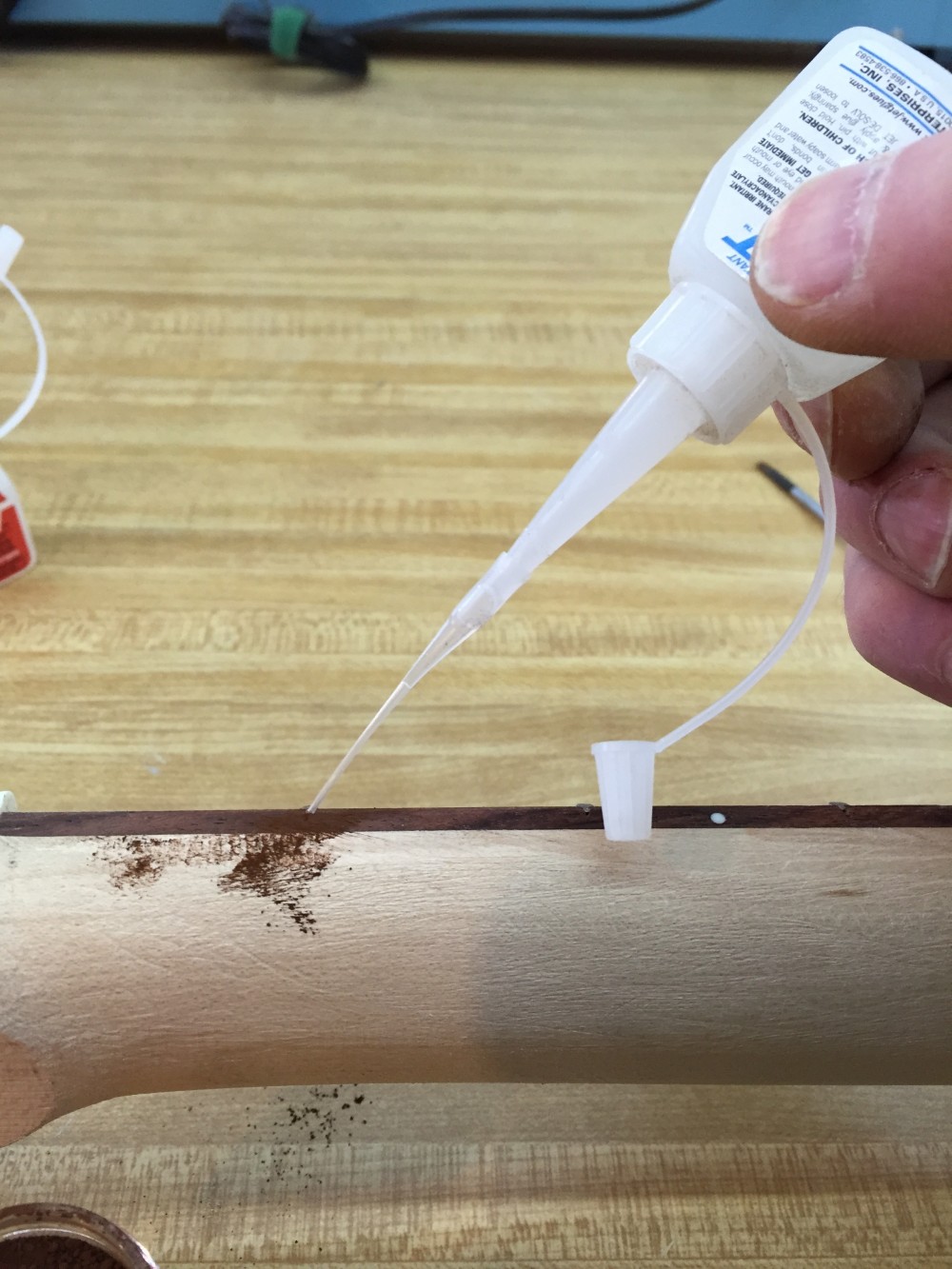 Below: Applying a very small amount thin grade Jet glue to bond the powder. Note: The thin grade glue has high capillary (as in water-like) consistency to it, hence the reason a very small amount is used. Overuse would have caused it to run through the board out to the other side.