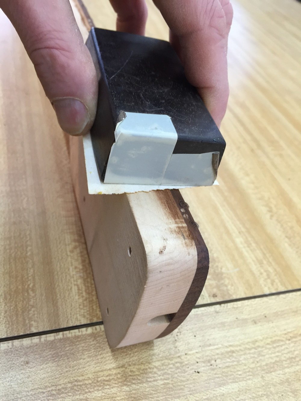 Below: Hard block being used with 150-grit sandpaper adhered to it, leveling off the dried glue and also doing finish sanding for a uniform smooth surface.