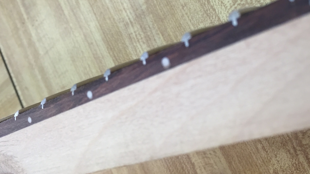 Below: Two Super Jet brand glues (medium/red and thin/blue), furniture powder (used as a filler material, rosewood dust could have also been used), 150-grit adhesive-backed sandpaper, a hard block and the neck itself.