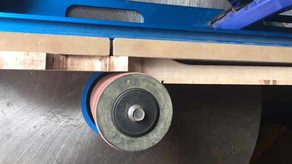 Use a spindle sander with a fence borrowed from the router table clamped on. As with most woodworking procedures it is important not to take away too much wood on the first cut. Do it in incremental steps. Bear in mind while you can always take away wood, it is impossible to put it back.