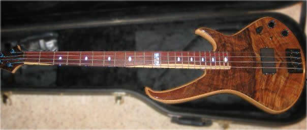 “My little brother, Steve Davis, made this bass for me at the Roberto Venn School of Luthiery. Note the white and black walnut fretboard, and my initials for the 12th inlay.