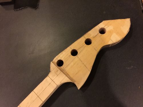In the last step, we laid out the headstock from a template. This template has the proper tuner hole locations right on the template itself.