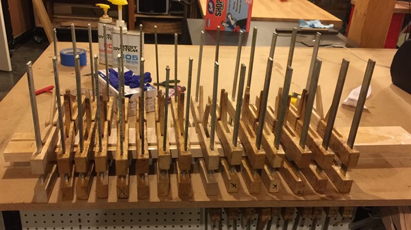 After truss rod is glued into the slot, the underside of the fingerboard is painted with epoxy, the board is attached to the neck and clamps are attached.