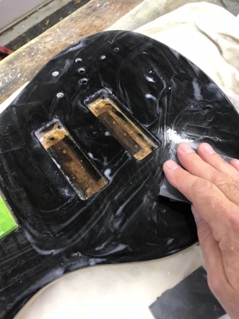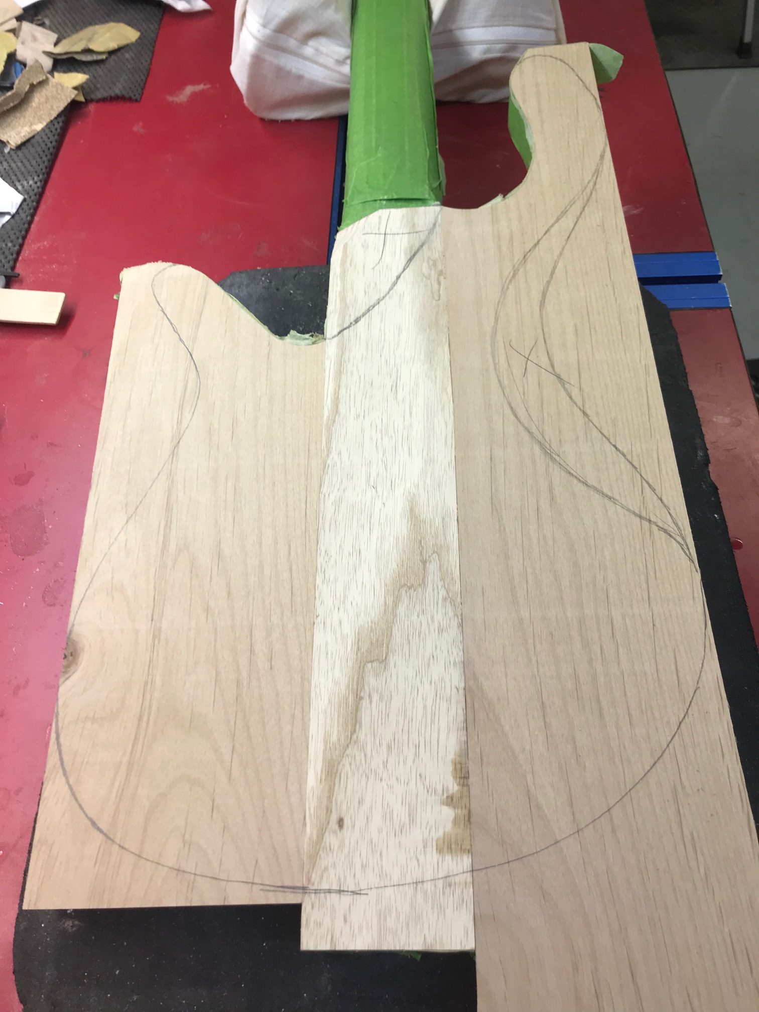 Body is Alder outers with a Swamp Ash center core. The inlay at the neck joint is Wenge. There is a thin layer of Makore between the body and the bookmatched flamed Maple top. The headstock is capped with the same two woods as is the matching ramp. I dyed the top black to match the black in the neck inlay. The body is finished in a catalyzed urethane…highly polished top and satin back.