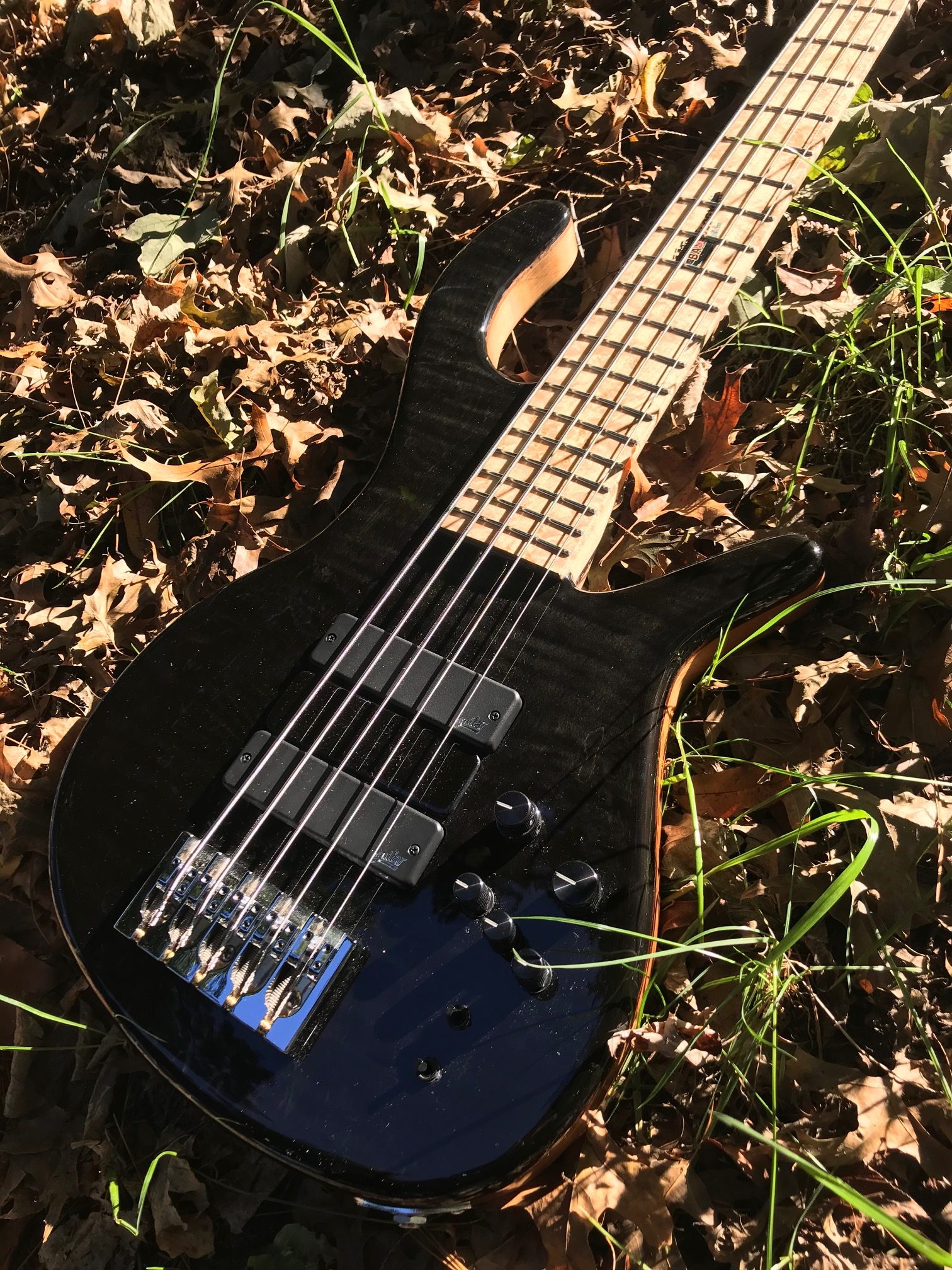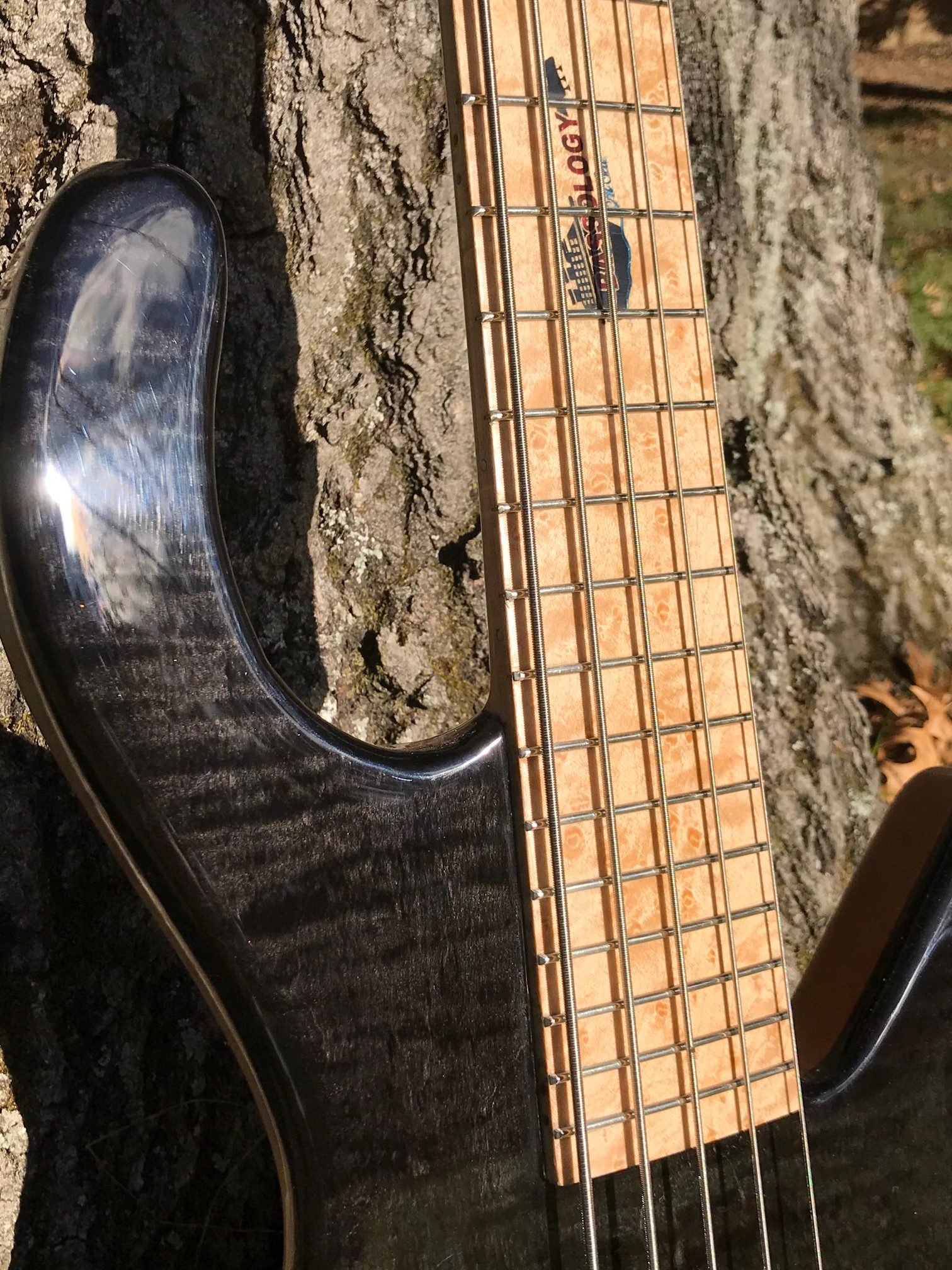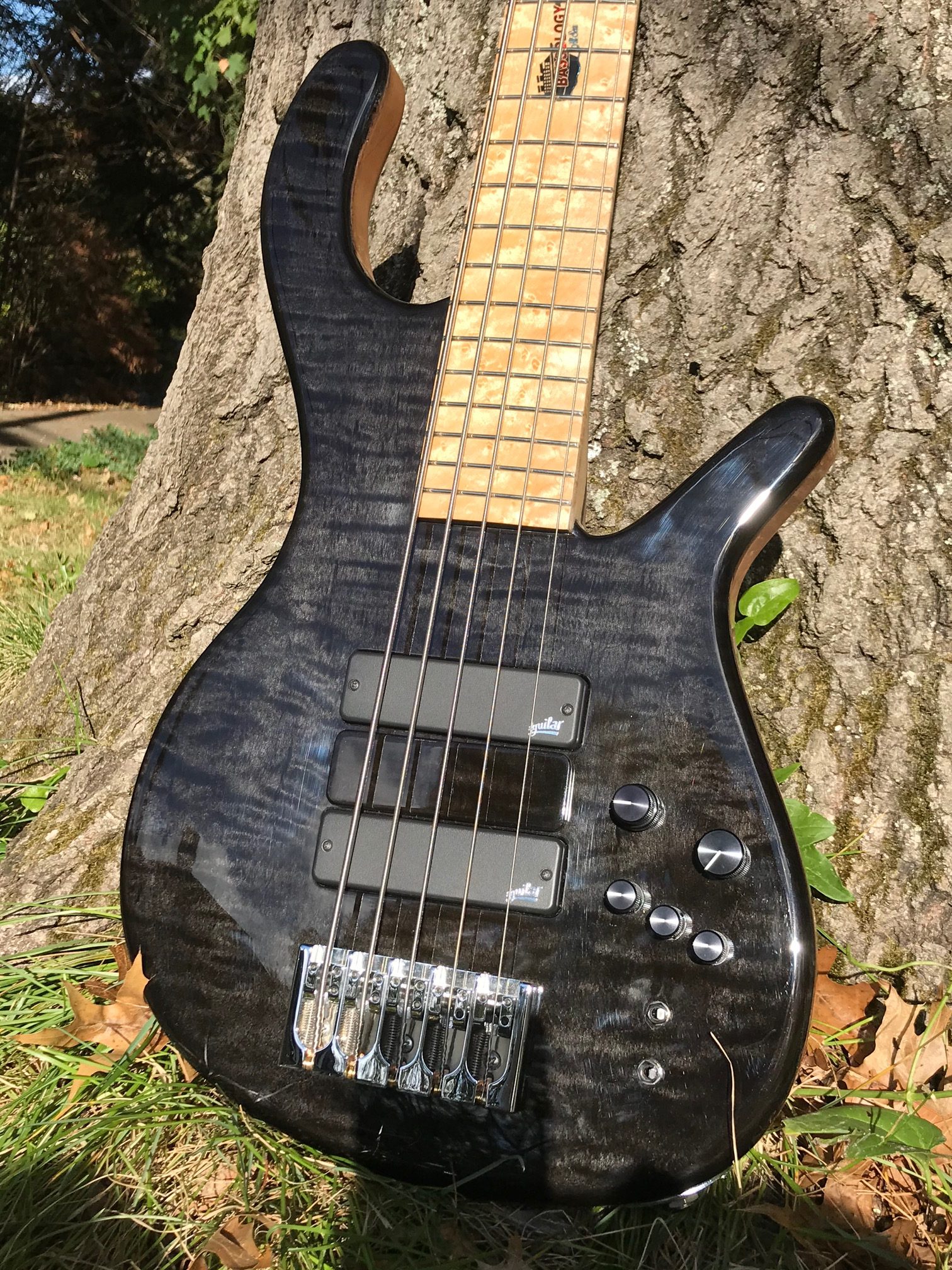 Electronics feature a Mike Pope Flexcore2 preamp and Aguilar DCB pickups. The tuners are Hipshot ultralite polished nickel. The bridge is Hipshot chrome plated aluminum. The nut is from Graphtech, and the strings are (owner supplied) Fodera ultralights.