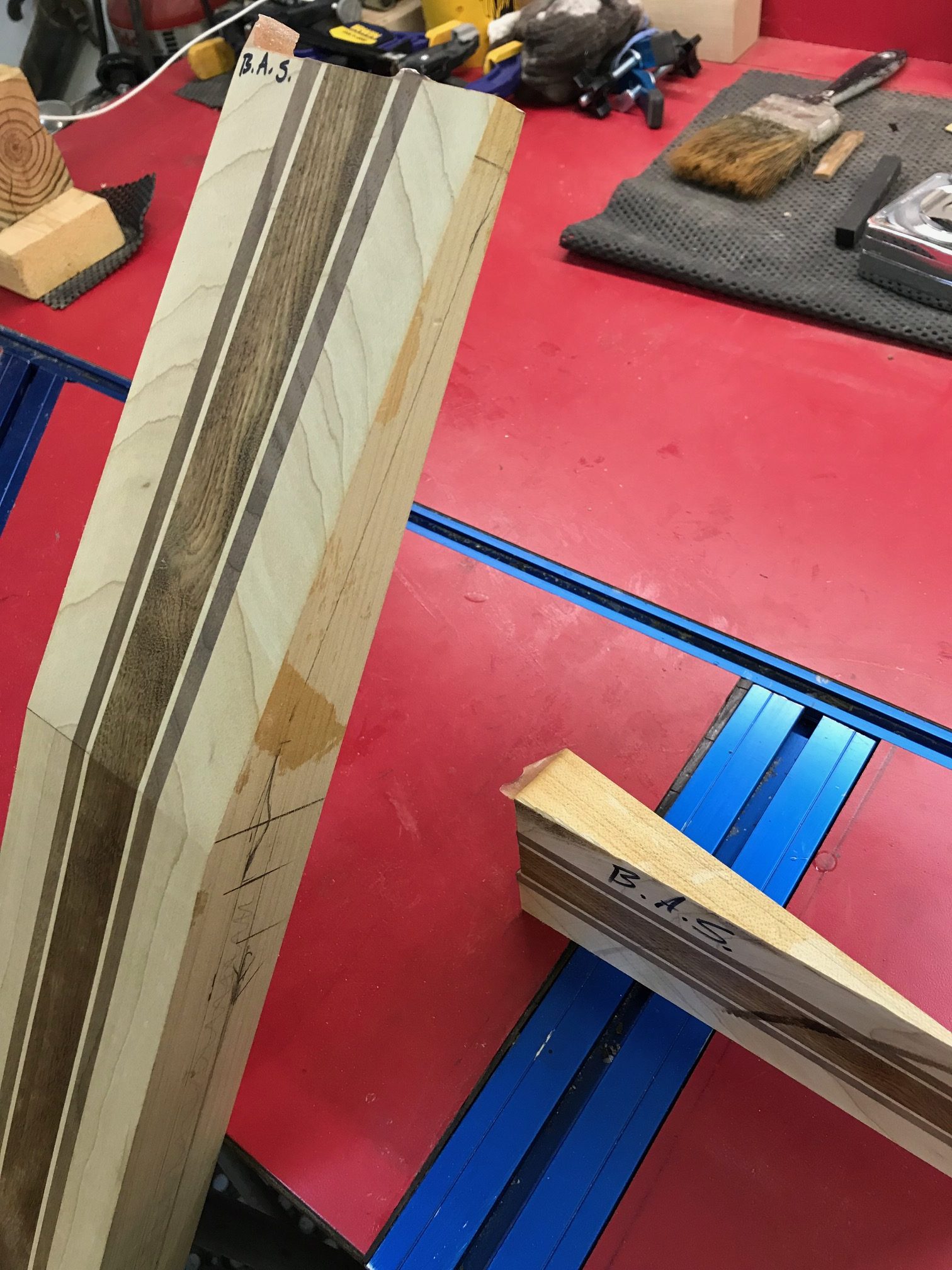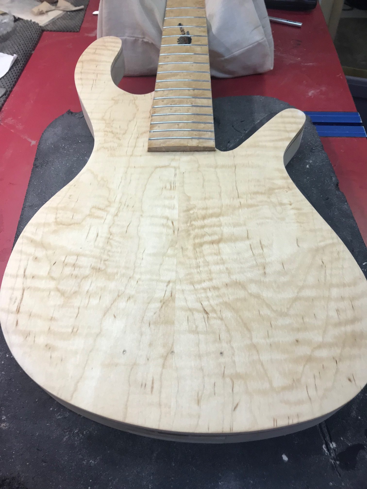 Neck is a neck through 7 piece laminate. Center is Chechen flanked by two thin strips of rock Maple, Walnut, and the outer parts are quarter sawn rock Maple. The fretboard is a beautiful birdseye Maple.