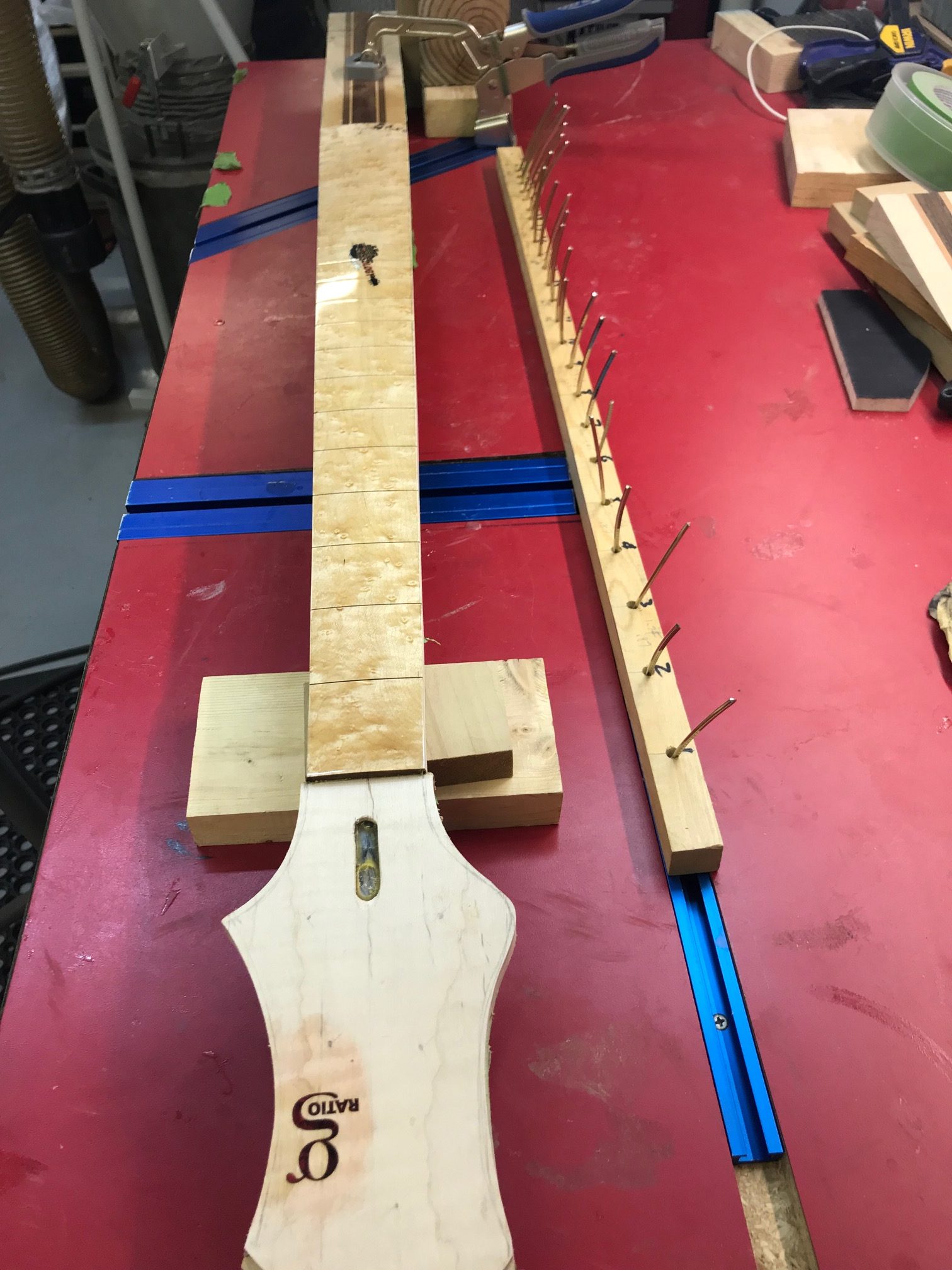 5 string, 34″ scale, 18.5 mm string spacing at the bridge per the customer. That’s all he requested…he left ever other aspect of the build to me.