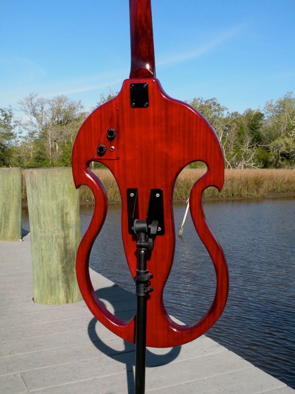 The bass has a 3 piece body made of sapele, an African hardwood similar to mahogany. It is finished with a transparent red dye and  15 coats of clear lacquer. It features a Musicman style humbucking pickup, and the controls are mounted out of sight on the back of the body for ease of adjustment while playing. It sits on a sturdy heavy duty stand which is adjustable for height and tilt. The 5 string neck is made by Carvin and is made of maple with an ebony fingerboard. The bass is fitted with Rotosound black nylon wrapped strings.