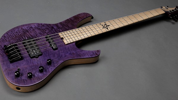 The body of this five string instrument is made from two piece swamp ash with quilted maple top colored in purple transparent paint. Neck has bolt-on construction with four independently recessed screws and is made from one piece wenge. Flamed maple fingerboard with 24 extra jumbo frets makes perfect contrast with top and the neck. Two-color headstock matches both neck and top and is looks like devils horn. Neck sits tight in neck pocket that provides best possible connection between neck and body.