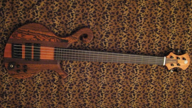 The final instrument is just what I was looking for. A fretless bass with presence and warm tone. The body core and neck are Honduran Mahogany. The top is Bocote with Black Walnut accents. Fretboard is Macassar Ebony with an epoxy finish. The input is Macassar Ebony and truss rod cover is Bocote. The electronics cavity is Cherry wood. Dual adjustment truss rod Schaller 3D bridge, Gotoh tuners. The electronics are passive custom wound Curtis Novak pickups. Each pickup has a volume and tone.