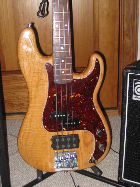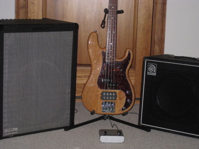 “This is my custom made 2008 Special Fender MIM P Bass. I have routed the bass and added a Music Man Humbucker in the bridge, a Babicz bridge,Fender flatwound strings,Custom engraved neck plate,had all the frets leveled and polished,moved the input jack to the bottom,coil tapped the Humbucker and installed CTS pots…..The amp in the pic is a 2000 Kustom KBA100 that rocks the house. I also use a Fender 2×10 extension cab from the mid 90’s.”