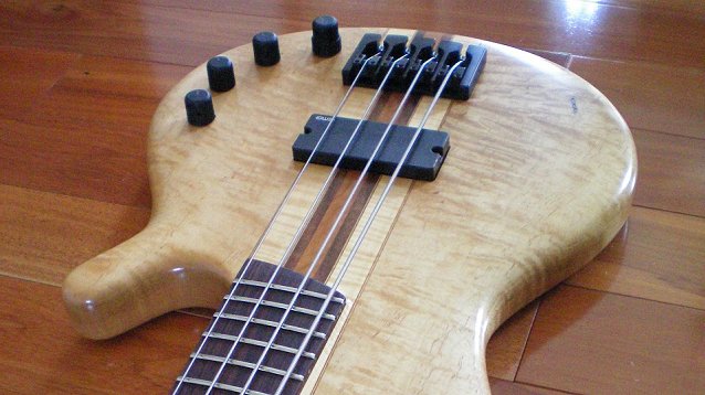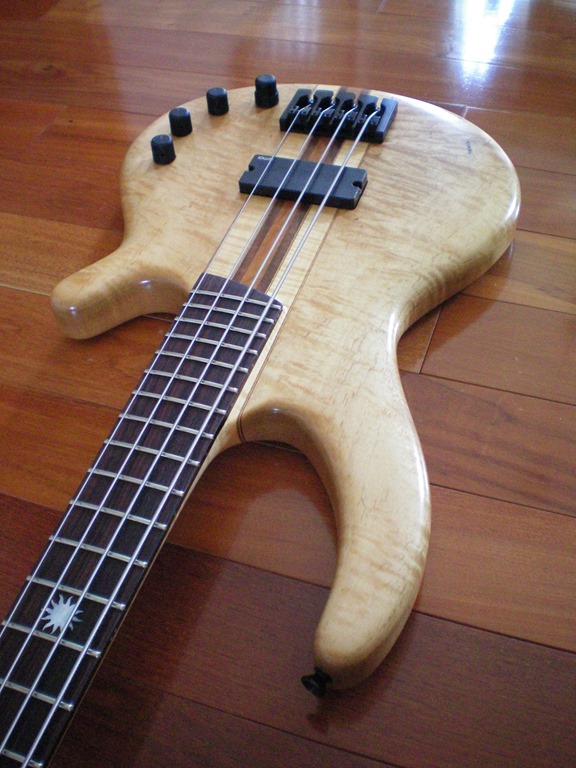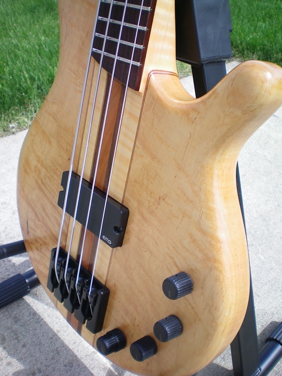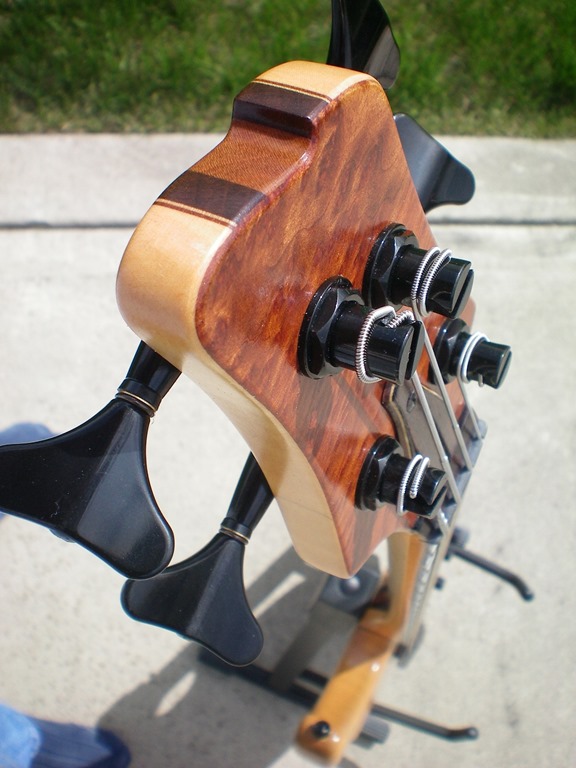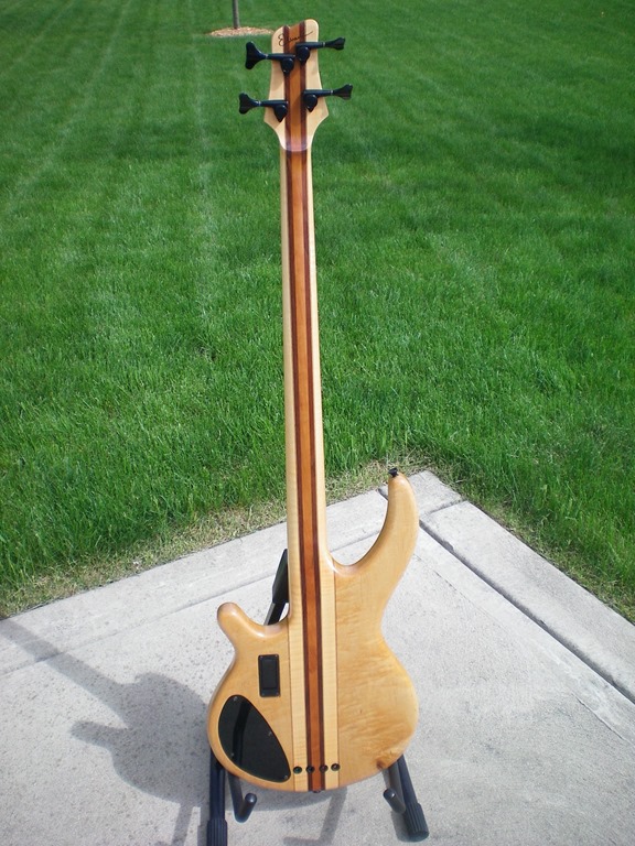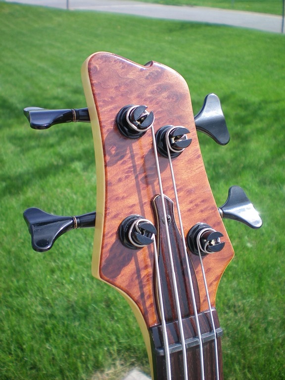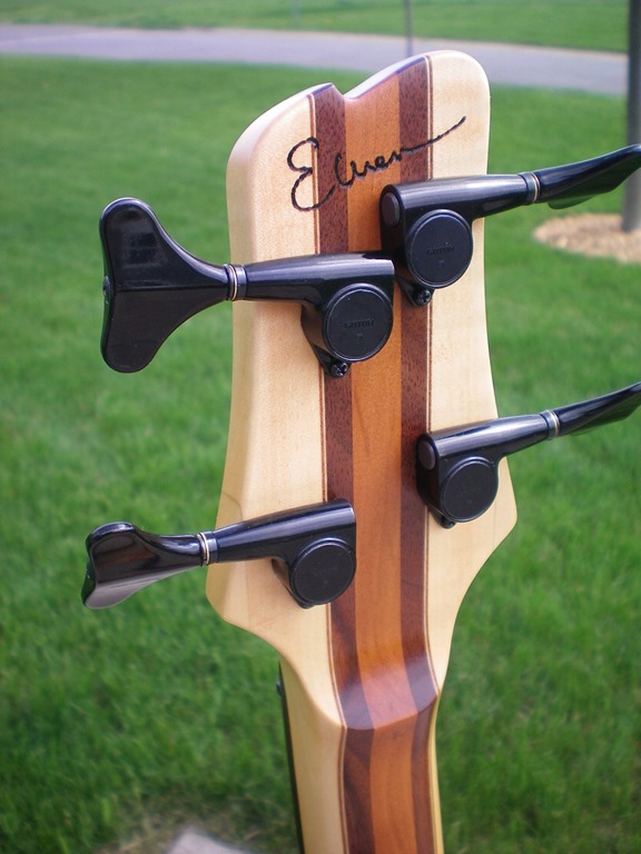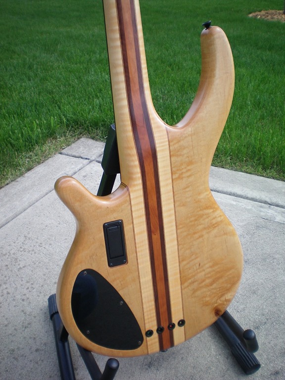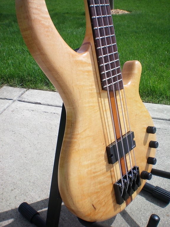 Here is a bass that I built over the cold winter months in my small basement shop.  I wanted something that was light yet well balanced, felt great in my hands, and had tone for days.  It is a neck-through design made from wood that I have had sitting around for a few years.  The body is primarily curly maple with some mahogany and maple veneer pinstripes; the center is cherry with walnut on either side.  The headstock overlay is redwood burl veneer and the truss rod cover is a rosewood and maple veneer sandwich.  I used a satin finish to preserve the natural look of the wood and maintain a smooth feel to the back of the neck.  Here is a breakdown of the hardware…