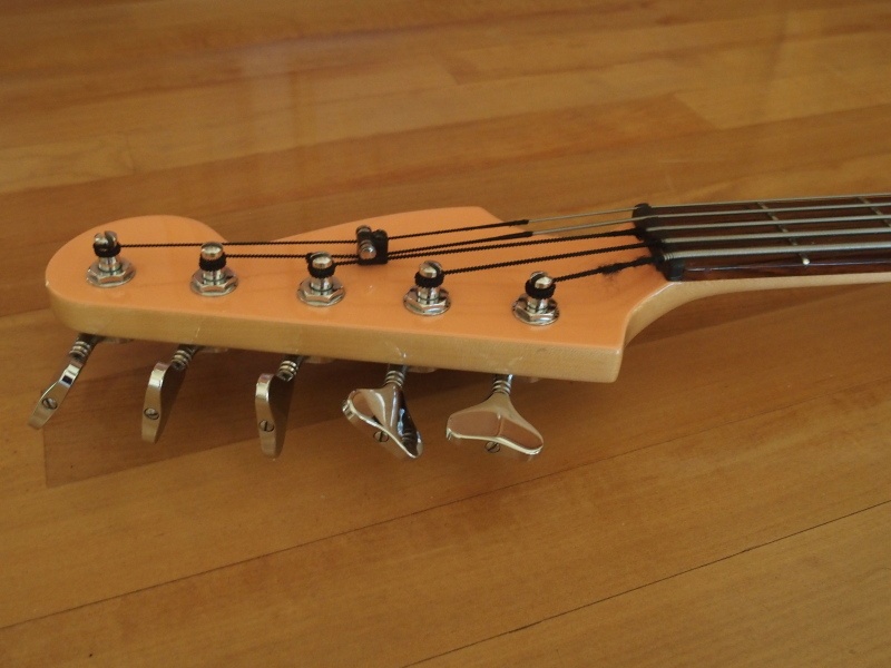 Mike Tobias made a neck to fit 5 in the space of a P neck (nut 1+3/4″), with 4 truss rods and 24 frets. There is a removable hatch in the fretboard between frets 21/22 to access nuts to adjust 2 pairs of truss rods.