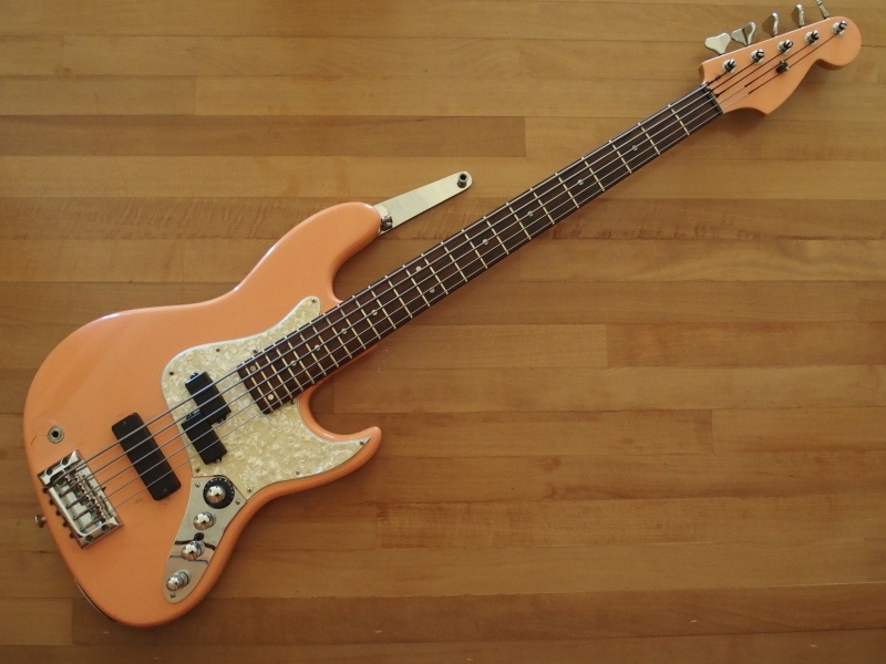 3. Flea has a shell pink ’62 Jazz bass actually. It was a custom shop color and very rarely used. It also had a pair of stacked knobs for each pickup. I think this bass is great. He has been shaping it to fit his needs from the beginning. Thats admirable. If it were a stock vintage and modded now, that would be sad. Not a factory origenal, but the mods tell a unique story.. Its very interesting squeezing 5 strings in a narrow neck. Also from his comments it sounds like there is two dual acting truss rods in the neck not four single rods in pairs. Love the coral pink!