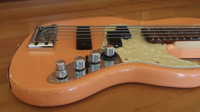 John Carruthers cut down the lower horn and painted it a stock 1958 Oldsmobile color. The Starz bridge was the only 5 string Mike could find with 17mm spacing.