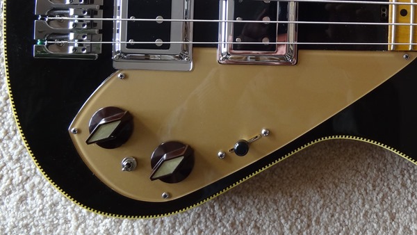 I wanted a retro looking bass with a jazz bass neck feel. The body is one piece swamp ash with a one piece quarter sawn maple neck comprised of a dual action truss rod and carbon fiber reinforced. Head stock is pitched at 17 degrees with Imbody pearl inlay on ebony. Hipshot hardware was used for the tuners and bridge. The pickups are Curtis Novack Darkstars with Vol/Tone, three way capacitor switch and are passive. Electronics cavity is fully shielded with 3M aluminum tape. Electronics are connected with bullet connectors so a different colored pick guard can be interchanged in minutes. I currently have white and gold that I swap out every now and then. Nicely balanced with no neck dive! Gene Imbody does great work and added some nice touches with the checker board binding and retro knobs.