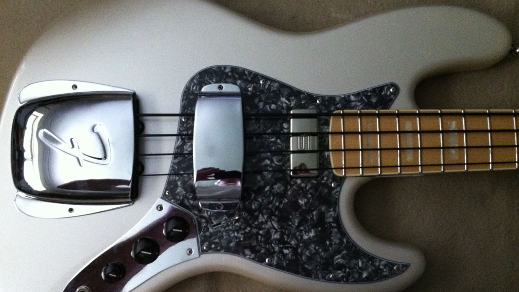 On my current set up, I have a Grey/Black perloid scratch plate and have strung Mr Stompy with Fender Nylon Tapewounds. Sounds great – very retro.