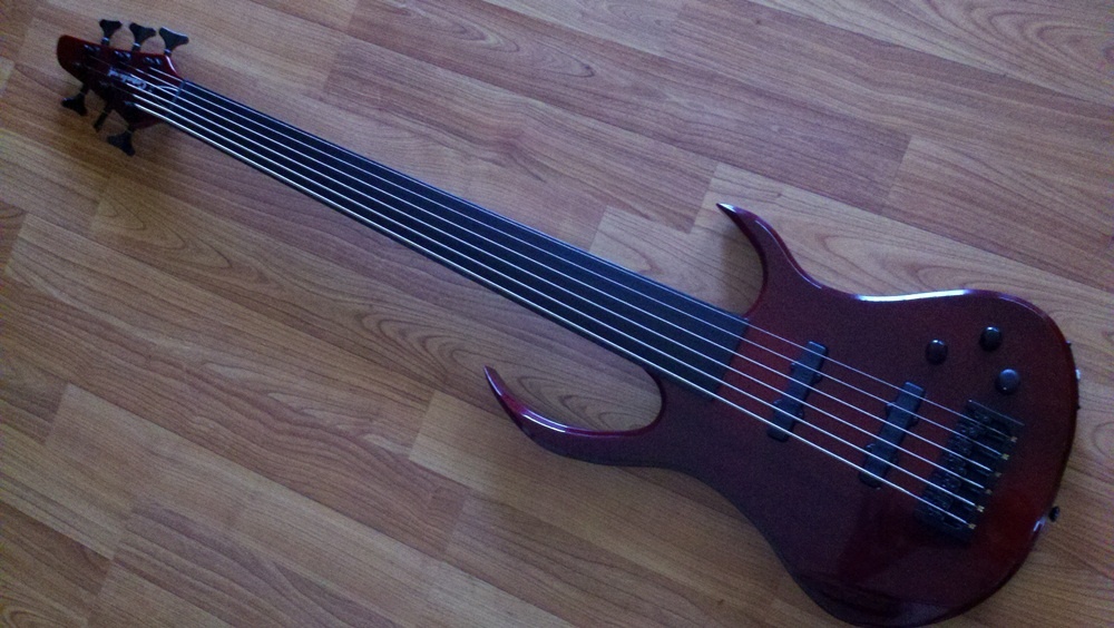 “This bass is my own one-of-a-kind custom design starting with a mahagony 6-string bass neck through the mahagony body with a Hipshot 6-string bridge. The fretless ebony fretboard has a 14″ radius and 34″ scale. It sports a Bartolini J-style set of pick-ups (purchased from Bestbassgear.com I might add) with completely noiseless passive electronics featuring Volume, Tone (250/.047) and Blend. It has a very warm tone and adjusting the blend and tone can produce various chorus-like effects. It has a Blood-Cherry nitrocellulose lacquer finish with low profile straplocks.“