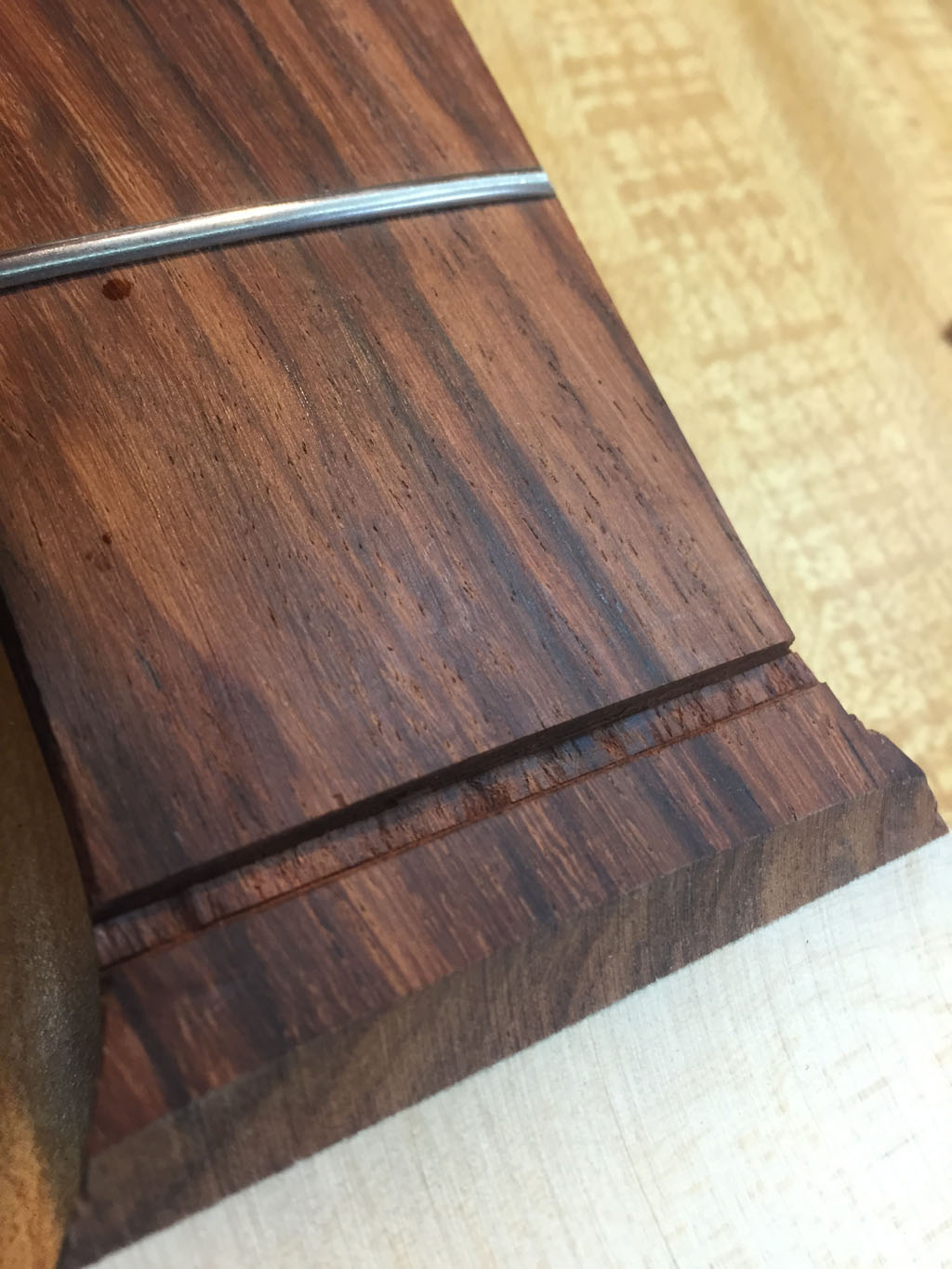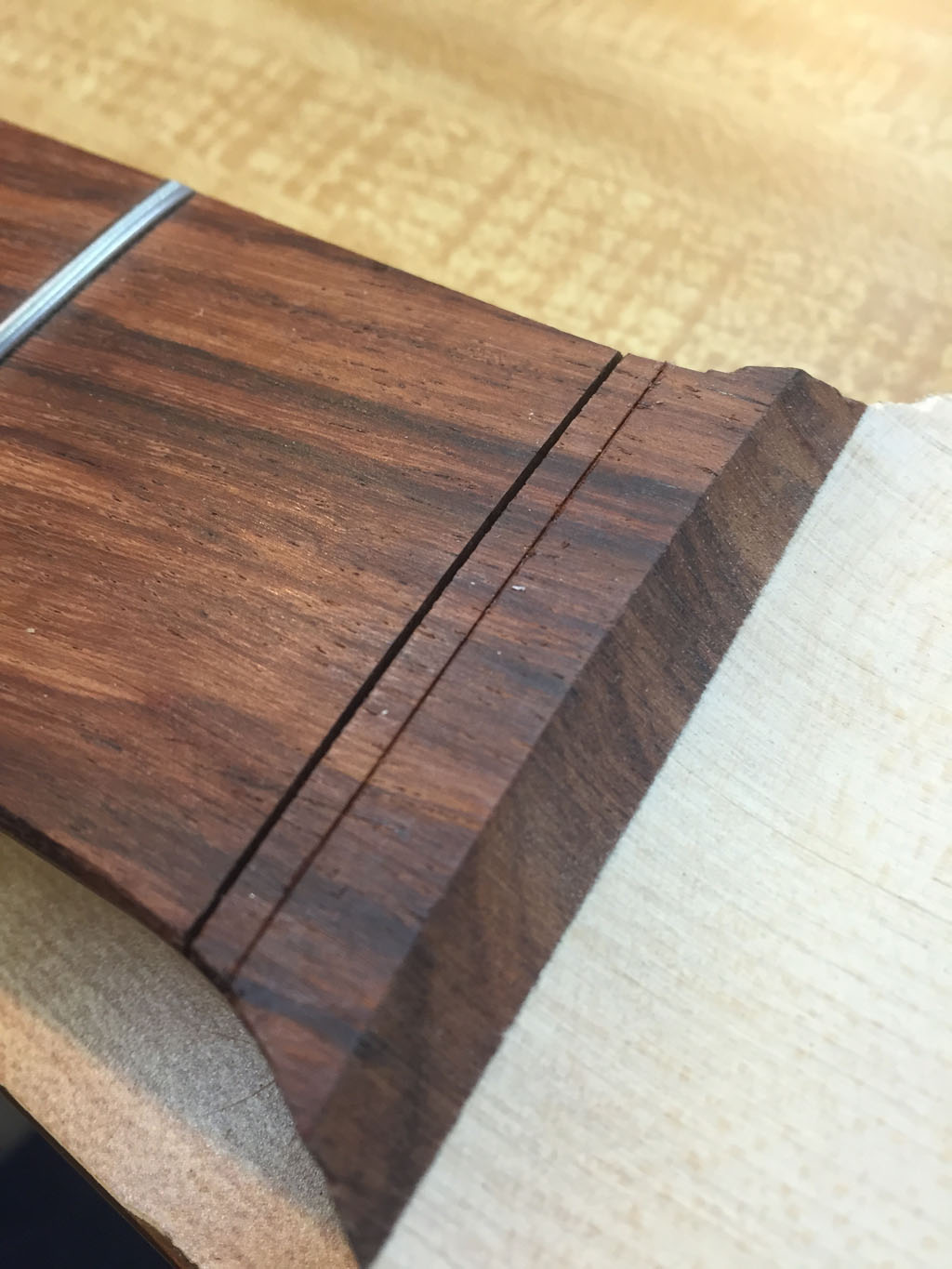 Below: A utility blade is placed into the slot as an anchor. The saddle is then placed against the blade so we can score a line in the fretboard. The acoustic saddle in this application happens to be the correct width we need for a proper distance from the slot.