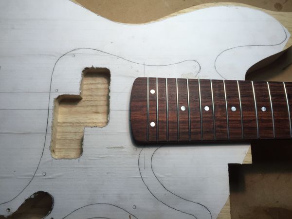 Below: Neck is inserted in place. Since this particular build has a very snug fit, no clamp is needed. If the fit was not snug, a clamp would be used.
