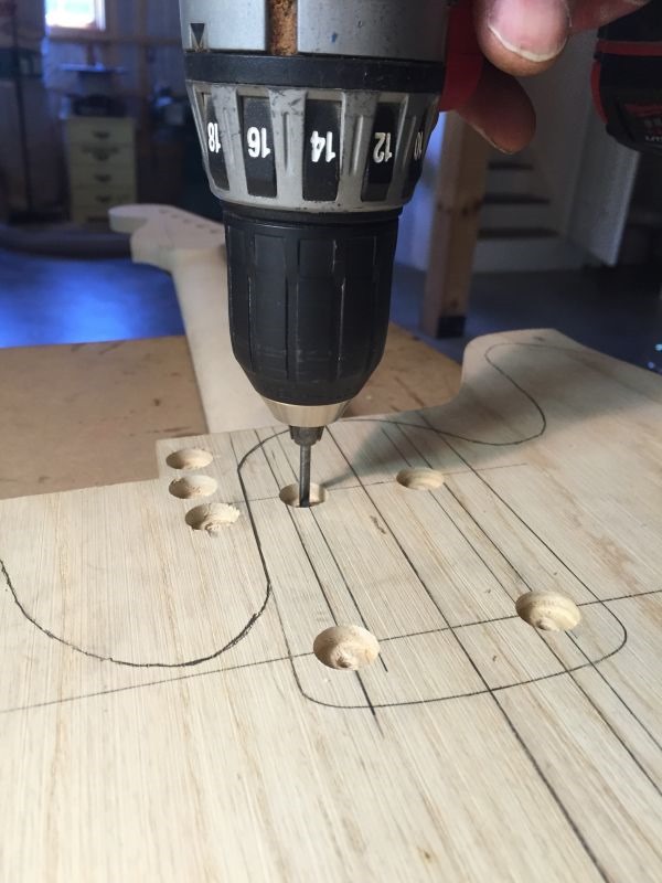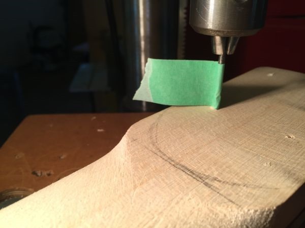 Below: Drilling holes into the neck using 1/8″ bit. The tape on the bit indicates what depth to stop.