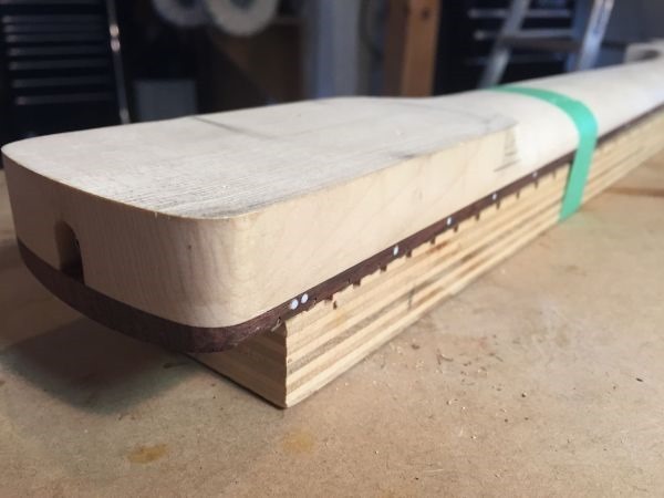 Below: Neck is taped to a caul to keep it from rocking when it is on the drill press table.