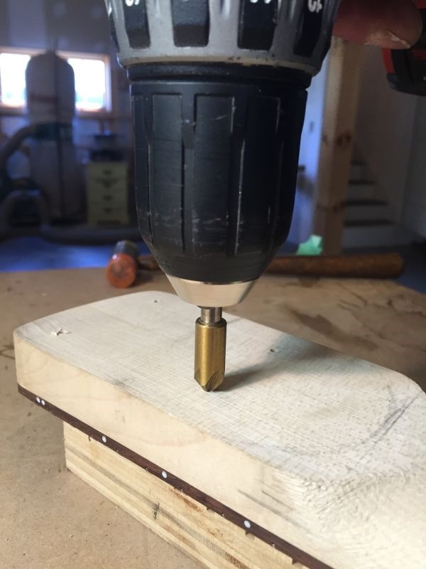Below: Chamfering the holes. This is to prevent wood breakage/waste when screws are installed later.
