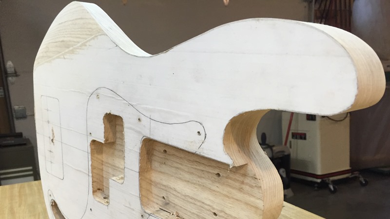 In this build step we shape out the forearm contour. This contour is not absolutely necessary but many bass players like it because it makes for a more comfortable playing experience whether seated or standing.